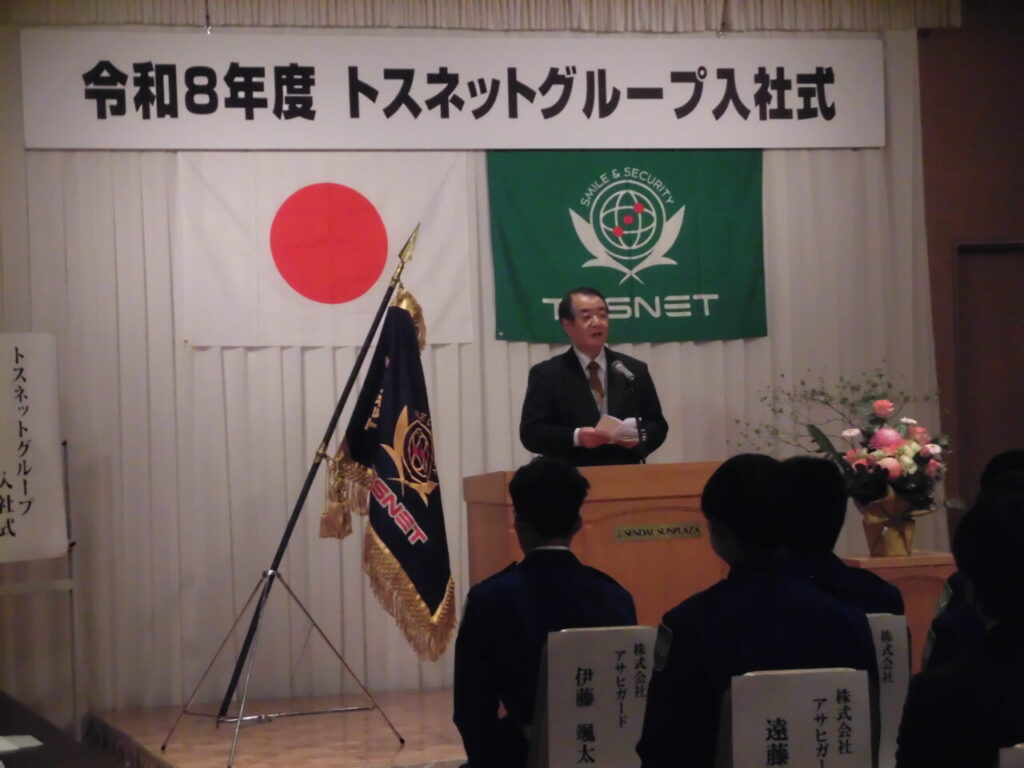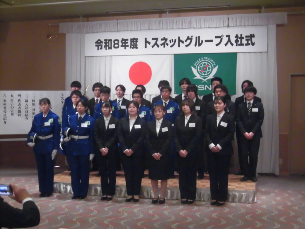 仙台サンプラザホールにて、トスネットグループ各社合同の令和8年度入社式が開催され、アサヒガード㈱入社の4名が出席しました。緊張しながらの合同入社式でしたが、各社の同期社員と顔合わせも叶い、気持ちを新たにしました。トスネット氏家社長より祝辞もいただき、トスネットグループコア事業の警備業:警備職として本当の意味でスタートしました!各社役員からも力強いお祝いの言葉も心に響いたように思います。どうか困難に負けないで、活躍する事に期待します!頑張れ!